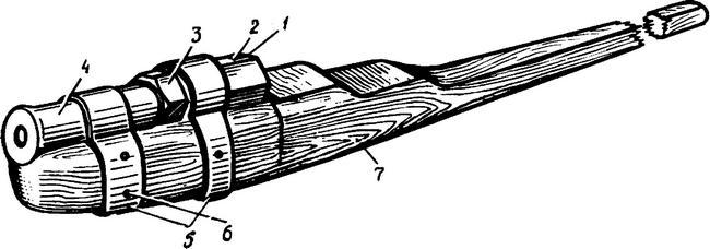 Русская пищаль калибра 31 мм (конец XIV – начало XV в.): 1 – канавка; 2 – затравочное отверстие; 3 – усилительное кольцо; 4 – ствол; 5 – железные обручи; 6 – гвоздь; 7 – ложа
