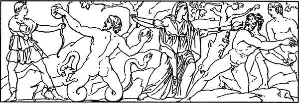 Рис. 6.3. Гигантомахия. Богини Диана и Геката в войне против титанов-гигантов. «Античный» барельеф. Взято из [524:1], с. 96, илл. 86.