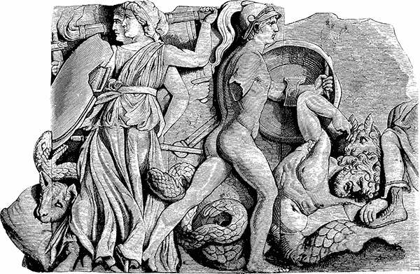 Рис. 6.5. Гигантомахия — борьба богов с титанами. «Факел»-пушка в руках богини направлен не просто горизонтально, а даже слегка вниз, на врага. Барельеф Пергамского Алтаря. Берлинский музей. Взято из [169:0], с. 149, илл. 153.