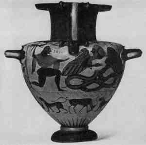 Рис. 6.8. Сражение Зевса с драконом Тифоном. Халкидская амфора из Вульчи. Якобы 550–530 годы до н. э. Мюнхен, Музей античного малого искусства. Взято из [453:2], с. 28.