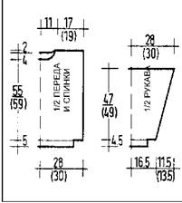 Спинку до выреза горловины вяжите по описанию переда. На 59 (63)-м см от конца резинки, что соответствует 172 (184) рядам, закройте для выреза горловины средние 29 петель, затем еще с обеих ее сторон 2 раза по 5 петель в каждом втором ряду.