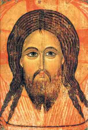 Рис. 1.39. Русская икона «Спас Нерукотворный». Первая половина XIII века. Государственная Третьяковская Галерея. Обратите внимание на длинные волосы Христа. Взято из [745:1], с. 11, икона 3.