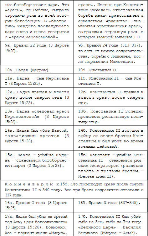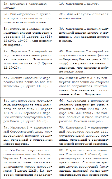 2) Оба династических потока открывают крупные политические и религиозные деятели: Иеровоам I — основатель «ереси Иеровоама»; Константин I Август (Священный), при нем возникло и окрепло арианство (аналог «ереси Иеровоама»). Иеровоам I ведет борьбу с отделившимся от него Ровоамом, а Константин I — с отделившимся от него Лицинием. Как при Иеровоаме I единое царство делится на два (богославское и богоборческое), так и при Константине I (перенесшем столицу из Рима в Новый Рим) возникает раздел империи (единой при Аврелиане = Сулле, Диоклетиане = Помпее, Констанции I Хлоре = Юлии Цезаре, то есть при аналогах Саула, Давида, Соломона). По Библии, богоборцы были разделены на 12 колен. Точно так же при Константине I Империя была разделена на 12 диоцез (провинций). В богоборческом царстве позднее к 12 коленам прибавилось еще одно — 13-е («потомство Дины»). Точно так же в Римской империи при Констанции II (сыне Константина I) к уже упомянутым 12 диоцезам добавился еще один — 13-й.