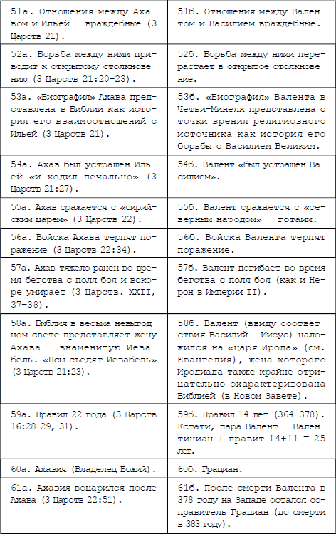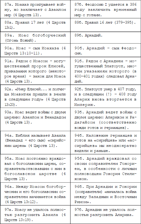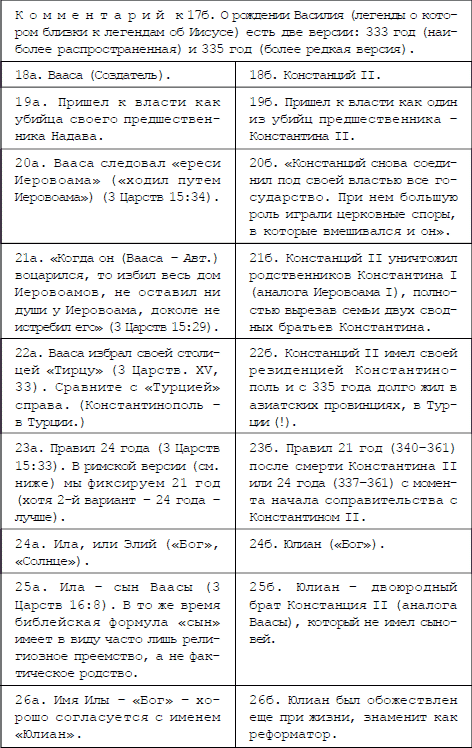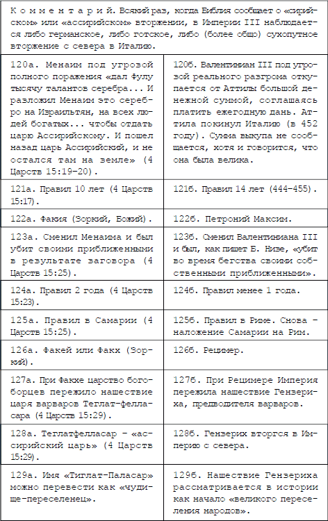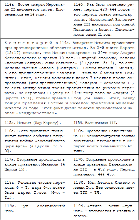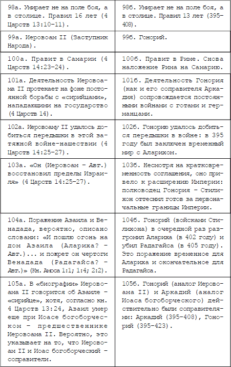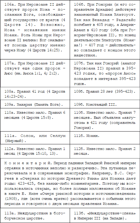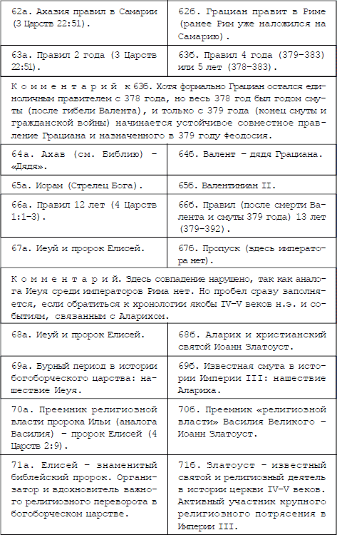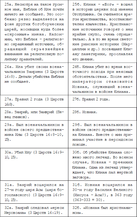 Отметим, что обсуждаемое здесь соответствие вторично — оно является следствием статистического наложения богоборческого и богославского царств на Римскую империю X–XIII веков н. э. Поименный перечень этого соответствия (с корреляцией длительностей правлений) указан на рис. 54 в томе 1. Перед тем как перейти к описанию событийных соответствий, сделаем несколько комментариев.