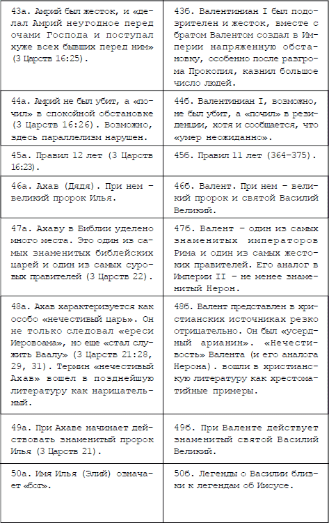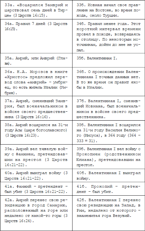 Приведем событийные соответствия, возникающие при сравнении богоборческого (Израильского) царства и Римской империи III–VI веков. Подчеркнем еще раз, что это соответствие — вторично: ни одна из версий приводимого сравнения не является оригиналом. Оригинал расположен значительно позже — в XIII–XVII веках н. э.