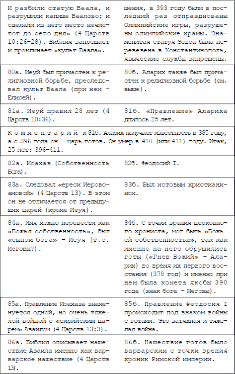 По Библии, богоборческое и богославское царства — это две ветви распавшегося на две части единого государства, наподобие того, как распалась на Западную и Восточную империи прежде единая Римская империя. Первые 3 царя — Саул, Давид, Соломон — правят еще единым государством. Раздел происходит после Соломона: Иеровоам I — первый отделившийся богоборческий царь, а Ровоам — первый отделившийся богославский царь. Библия содержит информацию о длительности правлений всех богоборческих и богославских царей. А.Т. Фоменко составил полную таблицу обоих династических потоков как результат тщательной обработки всех хронологических указаний Библии (рис. 53 в томе 1).
