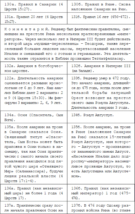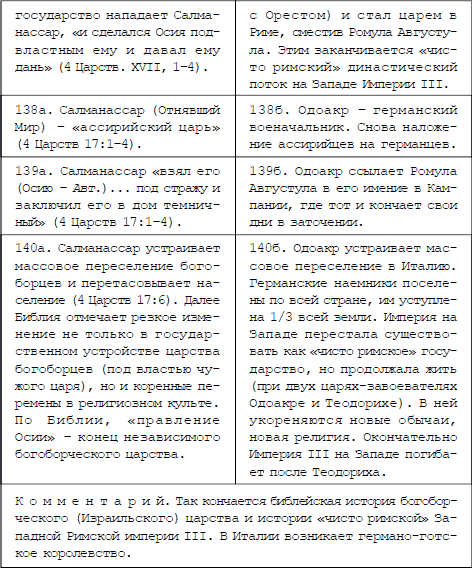 3) Оба потока завершают правители, попавшие под власть «чужого царя»: Осия — под власть Салманассара, Ромул Августул — Одоакра. При этом Салманассар — АШУРский царь («ассирийский»), а Одоакр — германский царь, что точно соответствует отождествлению библейской Ассирии, в частности, с Германией. Оба теократических потока заканчивают на этих правителях свое независимое существование. Два последних императора Империи III: Одоакр и Теодорих — уже не теократы Рима (не римляне), а цари, принадлежащие к чужой религии, что и отразилось в Библии при описании их «биографий».