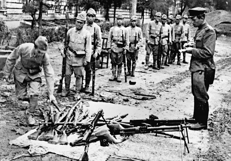 Капитуляцию солдат Квантунской армии принимает советский офицер