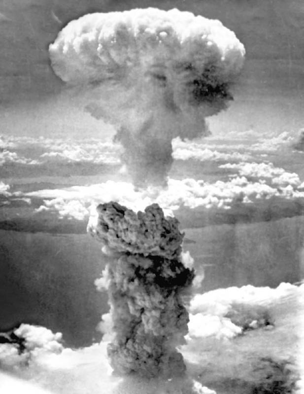 Взрыв атомной бомбы, сброшенной Соединенными Штатами на японский город Нагасаки. Утром 6 августа 1945 года американский бомбардировщик В-29 «Enola Gay», под командованием полковника Пола Тиббетса, сбросил на японский город Хиросима атомную бомбу «Little Воу» («Малыш») эквивалентом от 13 до 18 килотонн тротила. Три дня спустя, 9 августа 1945, атомная бомба «Fat Man» («Толстяк») была сброшена на город Нагасаки пилотом Чарльзом Суини, командиром бомбардировщика В-29 «Bockscar». Общее количество погибших составило от 90 до 166 тысяч человек в Хиросиме и от 60 до 80 тысяч человек – в Нагасаки