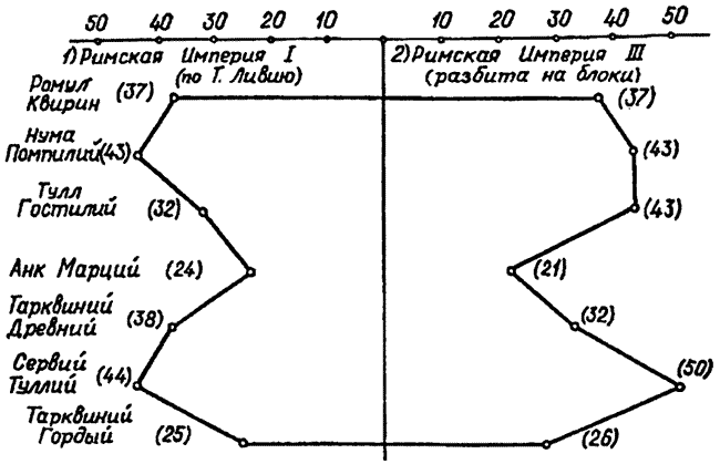Рис. 19. Статистическое наложение Царского Рима Тита Ливия (т. е. Римской империи I) на Римскую империю Диоклетиана (т. е. Римскую империю III), разбитую на блоки (эпохи).
