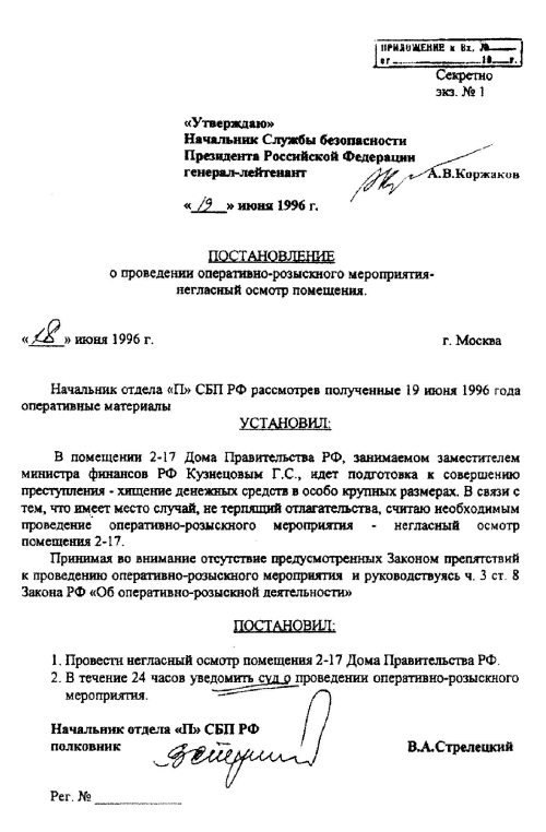 Получив официальное разрешение на негласный обыск, сотрудники Службы безопасности Президента вскрыли в Доме Правительства кабинет 2-17, принадлежащий заместителю министра финансов России Герману Кузнецову, по имевшейся информации, — одному из главных распорядителей «черной кассы». Улов оперативников оказался чрезвычайно любопытным и богатым. Помимо 1,5 миллиона долларов наличными в сейфе финансиста были найдены уникальные документы. Вплоть до середины сентября 1996 года о них мало кто знал и скорее всего и не узнал бы, если бы не случайность.