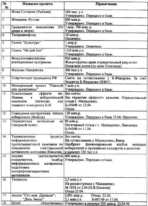 Это были агитационные проекты, датируемые до 21 мая. — несколько списков почти что на двадцати страницах. Включали они буквально все, что только могло прийти на ум чубайсовским пиарщикам.