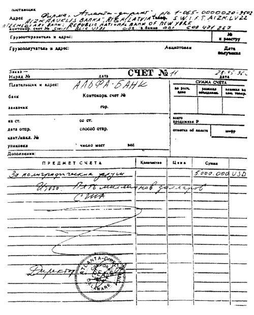 Все документы условно можно разделить на два пакета. В первый входила целая кипа платежных поручений для перевода денег в офшорные банки на Багамах, в США и Прибалтике. На большинстве из этих счетов стояла стандартная цифра 5 миллионов долларов и надпись: «За полиграфические услуги».