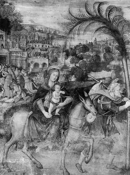 В евангельской версии Святое Семейство, напуганное царем Иродом, спасается бегством в Египет. Иосиф, Мария и Младенец Иисус покидают Иудею и направляются в далекую страну. Этот сюжет — один из самых популярных в средневековой живописи, см. рис. 1.59.