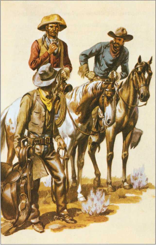 Каждый ковбой носил две вещи, которые теперь совершенно вышли из употребления: большой шейный платок, или бандана, и перчатки с крагами, часто с бахромой по бокам. Рубашки обычно были из плотной фланели какого-нибудь практичного цвета. Обратите внимание на рубашку одного из ковбоев на заднем плане рисунка — по тогдашней моде перед рубашки имеет форму щита.