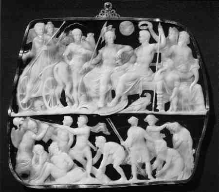 Рис. 7.6. «Гемма Августа». Датируется историками 10 годом н. э. [730:2], с. 82. Считается, что изображения на этом резном камне посвящены римскому императору Августу, жившему, по мнению историков, в начале I века н. э. Однако гороскоп, помещенный здесь в верхнем ряду, однозначно указывает на совсем другую дату: 8 декабря 1284 года н. э. Взято из [730:2], с. 82.