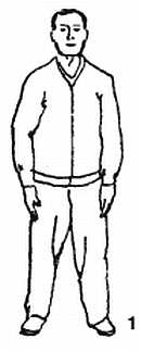 Положение стоя. Встаньте прямо, расставьте ноги на ширину плеч. Руки свободно опустите. Ладони прижмите к внешним поверхностям бедер. Голову держите прямо, кончик языка поднимите к верхнему нёбу. Вес тела распределите равномерно на обе ноги. Устраните посторонние мысли, расслабьтесь (рис. 1).