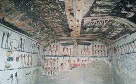 Рис. 7.17. Погребальная камера Рамзеса IX. Раньше в ней находился саркофаг фараона, но теперь его здесь уже нет. Однако погребальный зодиак фараона с датой его смерти (или захоронения), по счастью, сохранился на сводах потолка. Фотография 2006 года.