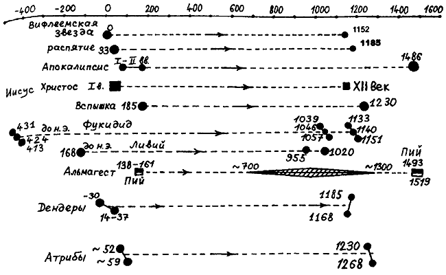Рис. 140. Согласование новых, точных астрономических дат с новой хронологией. В частности, сдвиги дат «античных» астрономических явлений хорошо согласуются с династическими параллелизмами.