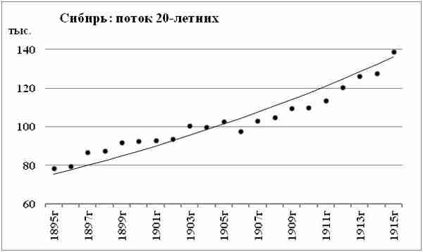 Как видите, поток 20-летних 5 регионов Сибири имеет неравномерность. Эта неравномерность в основном подобна потокам растущих детей. Ежегодный прирост 20-летних в целом по региону Сибирь около 3%, то есть больше, чем в Нечерноземном Центре. Поток 20-летних наглядно показывает, что демографическое развитие Севера «накануне» падения Царства Романовых было вполне равномерным.