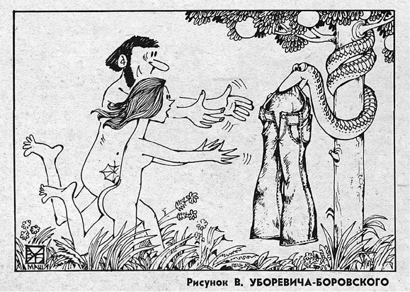 Карикатура о популярности джинсов. Крокодил. 1978. № 30. С. 4