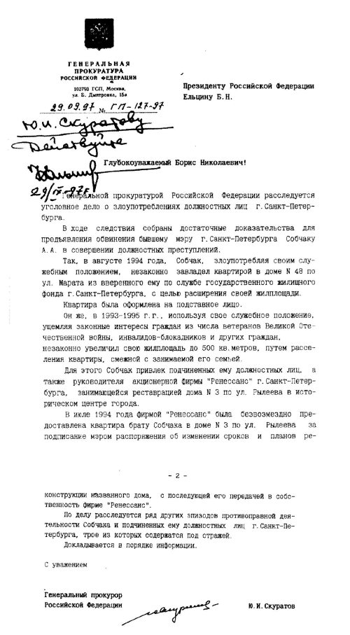 И ответ Э. Якубовского, заместителя руководителя следственной группы Генпрокуратуры: «Это неправда. Уголовное дело возбуждено 2 сентября этого года именно в отношении Анатолия Александровича Собчака. Возбуждено сразу по двум статьям: 170.2 УК РСФСР — «злоупотребление служебным положением при отягчающих обстоятельствах» и 290.4 пункт «г» — «получение взятки при отягчающих обстоятельствах»».