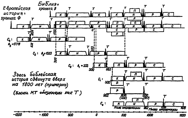 Далее, нанесем таким же образом на нашу схему строку «Б» — историю, изложенную в Библии, разместив ее на оси времени не в тех древних тысячелетиях, куда традиционно относят эту историю, а там, где должна она размещаться, в том единственном месте, где вся последовательность ее блоков совпадает со строкой «Е»: на интервале с VIII–IX веков до н. э. по XIV век н. э.