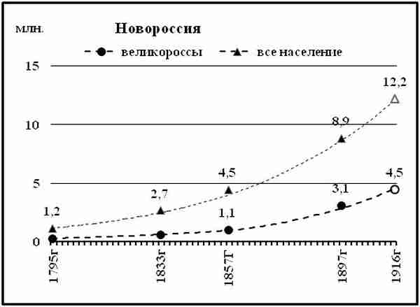 Диаграмма 15.6: Новороссия, график численности великороссов на фоне численности всего населения