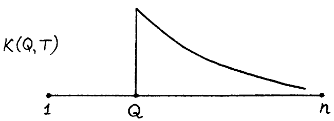 При хронологически правильной нумерации «глав-поколений» каждый график К(Q, T) должен иметь следующий вид. СЛЕВА ОТ ТОЧКИ Q ГРАФИК РАВЕН НУЛЮ, В ТОЧКЕ Q — АБСОЛЮТНЫЙ МАКСИМУМ ГРАФИКА, ПОТОМ ГРАФИК ПОСТЕПЕННО ПАДАЕТ, БОЛЕЕ ИЛИ МЕНЕЕ МОНОТОННО ЗАТУХАЕТ, рис. 24.