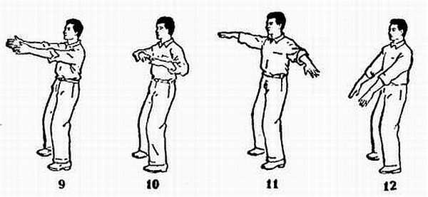 4. «Смешанное стояние столбом»: при выполнении этой разновидности «столба» руки последовательно меняют положение, как изображено на рис. 7—12. Стояние в каждой из этих поз может занимать от одной минуты (на начальном этапе) до 10 мин (на последующих).