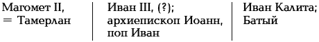 Но в образе Ивана Калиты есть и более поздний слой, спустившийся вниз из XV века при очень сильно выраженном в истории Руси глобальном 100-летнем сдвиге. Это слой от великого князя Ивана III (он же «хан Иван» (см. выше). Таким образом, возникает цепочка дубликатов (здесь строки дублируют друг друга):