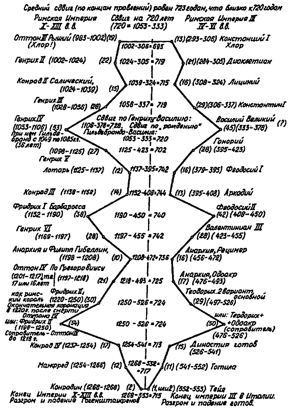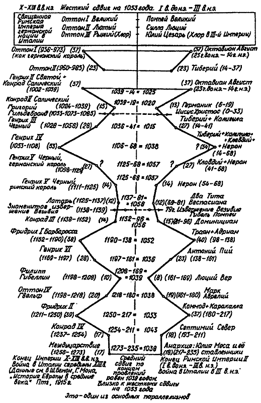 В Империи II (начиная с Августа и кончая Каракаллой) в соответствие не вошли только: Виттелий, Гальба, Нерва, Клодий Альбин, Дидий Юлиан, Песценний Нигр, Пертинакс, Гета, Отон. Однако все они — правители очень «кратковременные», и поэтому некоторые хроники могли о них не упоминать. Итак, на указанном интервале Империя X–XIII веков исчерпана полностью, а Империя II — за исключением нескольких «кратковременных императоров». Каждый правитель Империи X–XIII веков был и германским королем, и римским императором, отсюда — две даты коронования (и две длительности правления). Важно: во всех случаях в соответствие входят длительности правлений императоров Империи X–XIII веков именно как германских королей. Изоморфизм имеет вид: