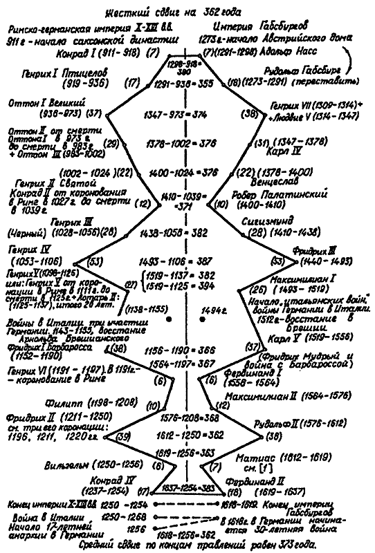 Рис. 23. Статистическое наложение Римско-Германской империи X–XIII веков н. э. на Империю Габсбургов XIII–XVI веков н. э.