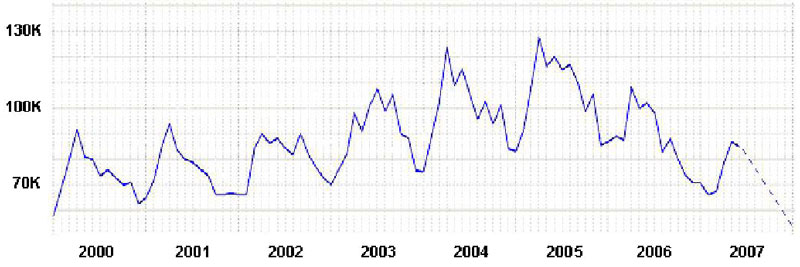 С моей точки зрения, пересечение кривой доходов с кривой ипотечных кредитов само по себе должно было стать очень серьезным сигналом для всех операторов, что в самое ближайшее время начнется массовый невозврат кредитов. Что и не замедлило случиться — в первом квартале 2007 разразился кризис на рынке субстандартных (выданных ненадежным заемщикам) ипотечных кредитов, которые составляют около 25% всех закладных. Правда ФРС как всегда читает мантры, что это не угрожает ипотечному рынку в целом, но цену этим заклинаниям мы все уже знаем.