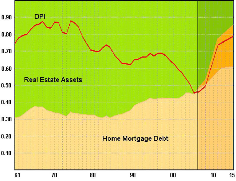 2004 2005 2006 2007 2008 2009 2010 RE Assets 18982.0 22084.6 22943.6 20978.0 17037.8 16572.6 16507.2 Mortage Debt 7835.3 8874.3 9865.0 10538.5 10496.9 10334.4 10235.8 HMD/REA 41.3% 40.2% 43.0% 50.2% 61.6% 62.4% 62.0% DPI 8889.4 9277.3 9915.7 10403.1 10806.4 10917.3 11095.9 DPI/REA 46.8% 42.0% 43.2% 49.6% 63.4% 65.9% 67.2%http://www.federalreserve.gov/releases/z1/Current/z1.pdf