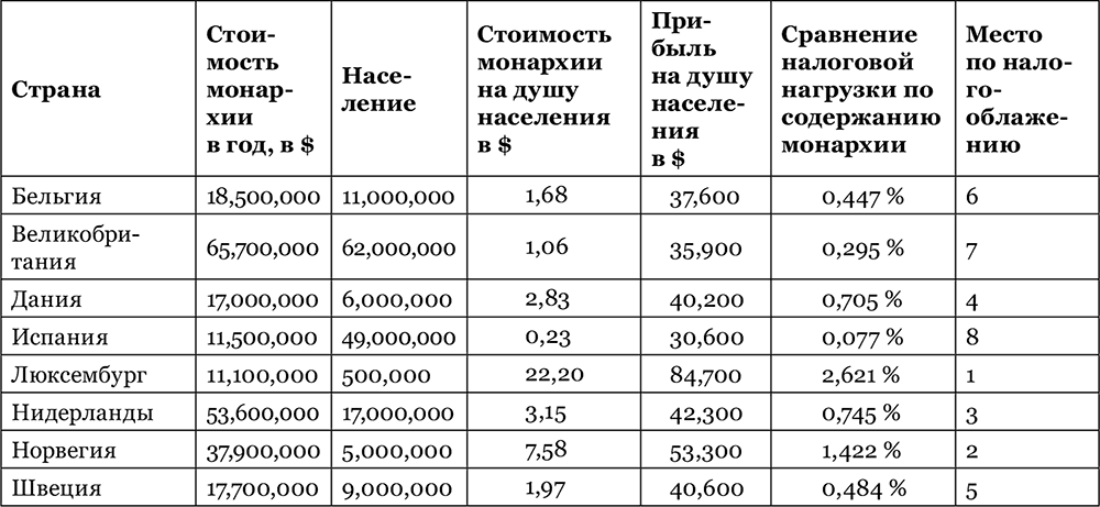 Ниже приведена сравнительная таблица, которая вносит ясность в спорный вопрос о дороговизне монархий. Ведь дело состоит не в том, какова итоговая сумма на содержание королевских домов в Цивильном листе, а каково соотношение налоговой нагрузки содержания монархии на душу населения. Несмотря на то, что британская монархия всегда считалась самой дорогой (исходя из суммы указанной в Цивильном листе), она стоит всего лишь на седьмом месте по обременительности для налогоплательщиков, обходясь британцам примерно в стоимость пакета молока (около 66 пенсов)[344], в то время как люксембуржцы вынуждены отдавать 22$в год.