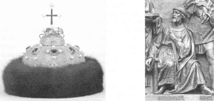“Шапка Мономаха” (Оружейна палата Кремля) та Володимир Мономах на пам’ятнику “Тисячоліття Росії” (Новґород, 1862 рік)