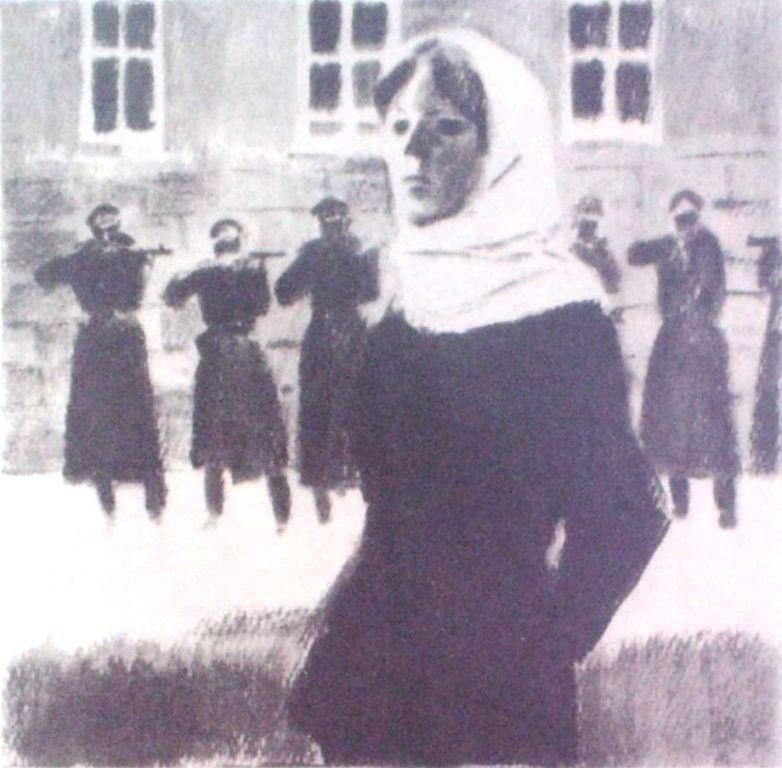 Ее вывели к белой стене, и она послушно легла с двумя пулями в сердце на то место, где лежал рабочий в ситцевой рубашке. И пока не увезли ее, серые опушенные глаза непрерывно смотрели в октябрьское суровое и грозное небо.