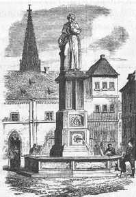 Рис. 3.8. Памятник Бертольду Шварцу на центральной площади германского города Фрейбурга. Гравюра 1854 года. Взято из Интернета. Фактически это — памятник святому Сергию Радонежскому.