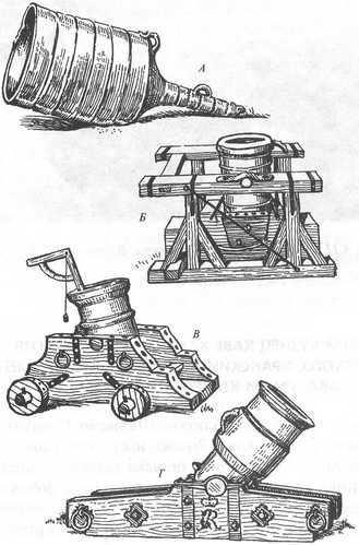 Рис. 3.10. Старинные мортиры: Л — мортира из замка Бодиэм; Б — мортира XVI века; В — мортира XVII века; Г — мортира XVIII века. Взято из [366:1], с. 95.