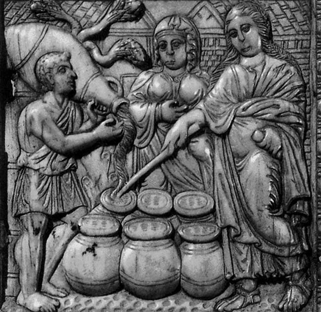 Рис. 226. Пир в Канне. Христос превращает воду в вино. Пластина из слоновой кости. Сицилия, якобы 450–460 годы. Взято из [463:2], с. 45.