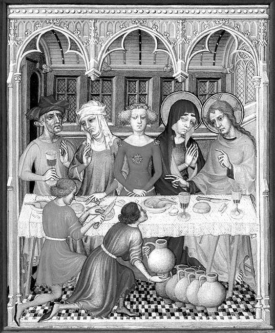Рис. 227. Христос превращает воду в вино на пиру в Кане. (Les Tres Belles Heures de Notre-Dame du Duc Jean de Berry). Якобы конец XIV — начало XV века. Взято из [1075:1], с. 234. О чем на самом деле рассказывает здесь Евангелие, см. в нашей книге «Царь Славян».