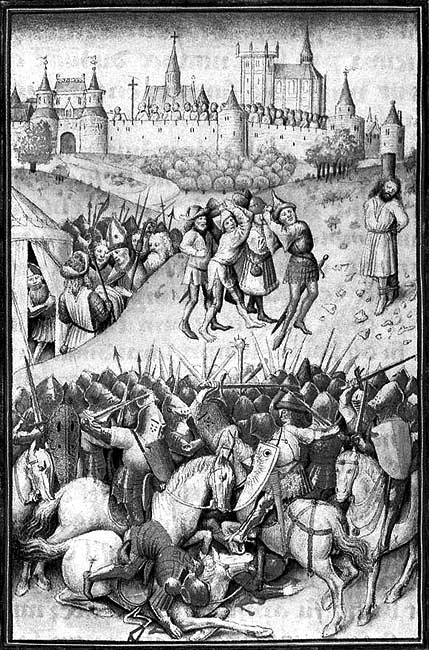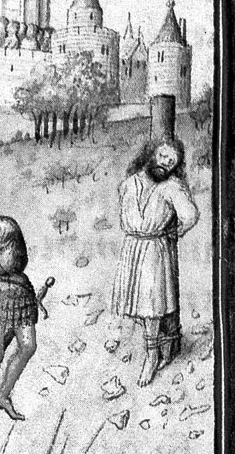 Рис. 228. Старинная миниатюра из книги «Les Grandes Chroniques de France», якобы середины XV века. Изображена казнь князя Велизария (Великого Царя?). Его привязали к столбу и побили камнями. Взято из [1485], илл. 186.