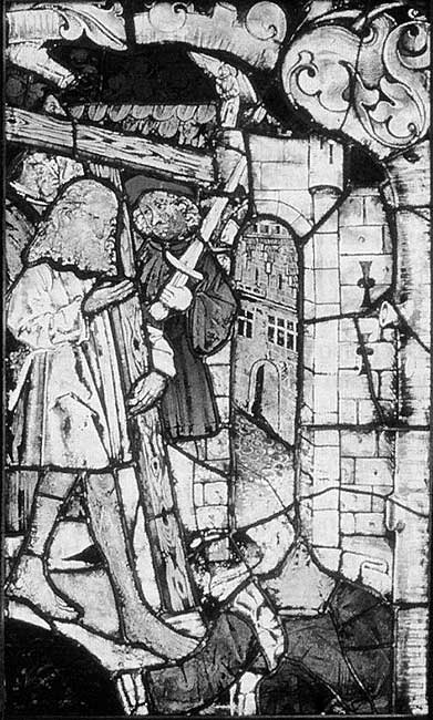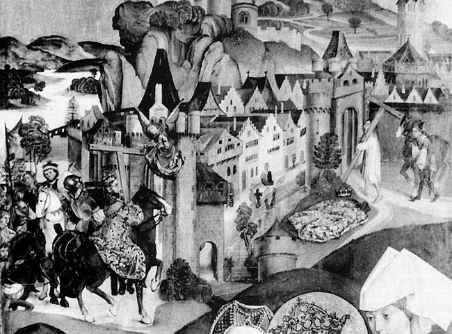 Рис. 231. Фрагмент картины из правого флигеля алтаря Катерины (1485–1490) художника Михаила Вольгемута (Michael Wolgemut). Как сообщают историки, здесь изображен царь Гераклий, то есть Геракл [1425], с. 8. Он подъезжает к Иерусалиму на коне, а затем изображен у ворот Иерусалима босым, в простой рубашке, несущим большой крест. Взято из [1425], с. 8.