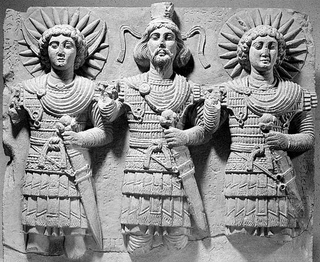 Рис. 234. «Античная» скульптура из Пальмиры, так называемая «Триада Пальмирских Богов», якобы 150 год до н. э. Очень похоже, что это изображения христианских святых с нимбами вокруг головы. У одного из них над головой — османский полумесяц. Взято из [1237].