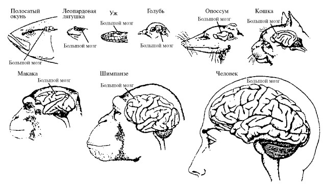 Увеличение размеров мозга у позвоночных от рыб, рептилий, птиц до человека