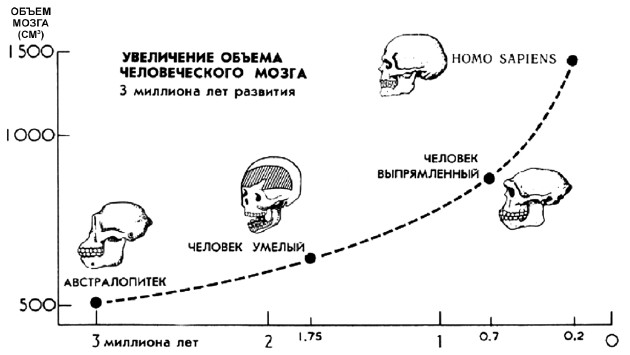 За два миллиона лет содержимое черепной коробки гоминид возросло почти в пять раз, а площадь коры мозга, средоточие рассудка, в 20–25 раз. Существенно изменилось сравнительно немногое: ступня и гортань, положение тела при хождении, пропорции конечностей, череп и мозг. А результат колоссальный!