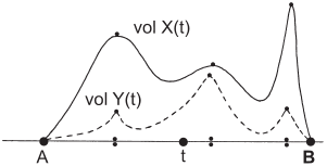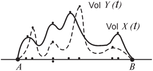 б) Напротив, если летописи Х и Y заведомо независимы, то есть описывают либо разные исторические периоды (А,В) и (C,D), либо разные «потоки событий» в разных государствах, то графики объемов для летописей Х и Y достигают локальных максимумов в разных точках. Другими словами, точки всплесков графиков vol X (t) и vol Y (t) не должны коррелировать. При этом считается, конечно, что для сравнения двух графиков мы должны предварительно совместить отрезки (А,В) и (C,D) одинаковой длины.