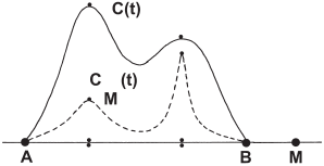 Рис. 36. График «первичного фонда информации» C (t) и график «уцелевшего фонда информации» (то есть текстов, сохранившихся до эпохи М) делают всплески практически одновременно.