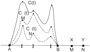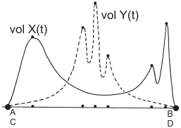 Рис. 40. Графики объемов независимых летописей X и Y, то есть говорящих о существенно разных эпохах, делают всплески в разных точках (после совмещения отрезков времени (A,B) и (C,D).